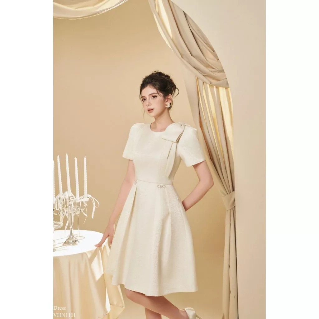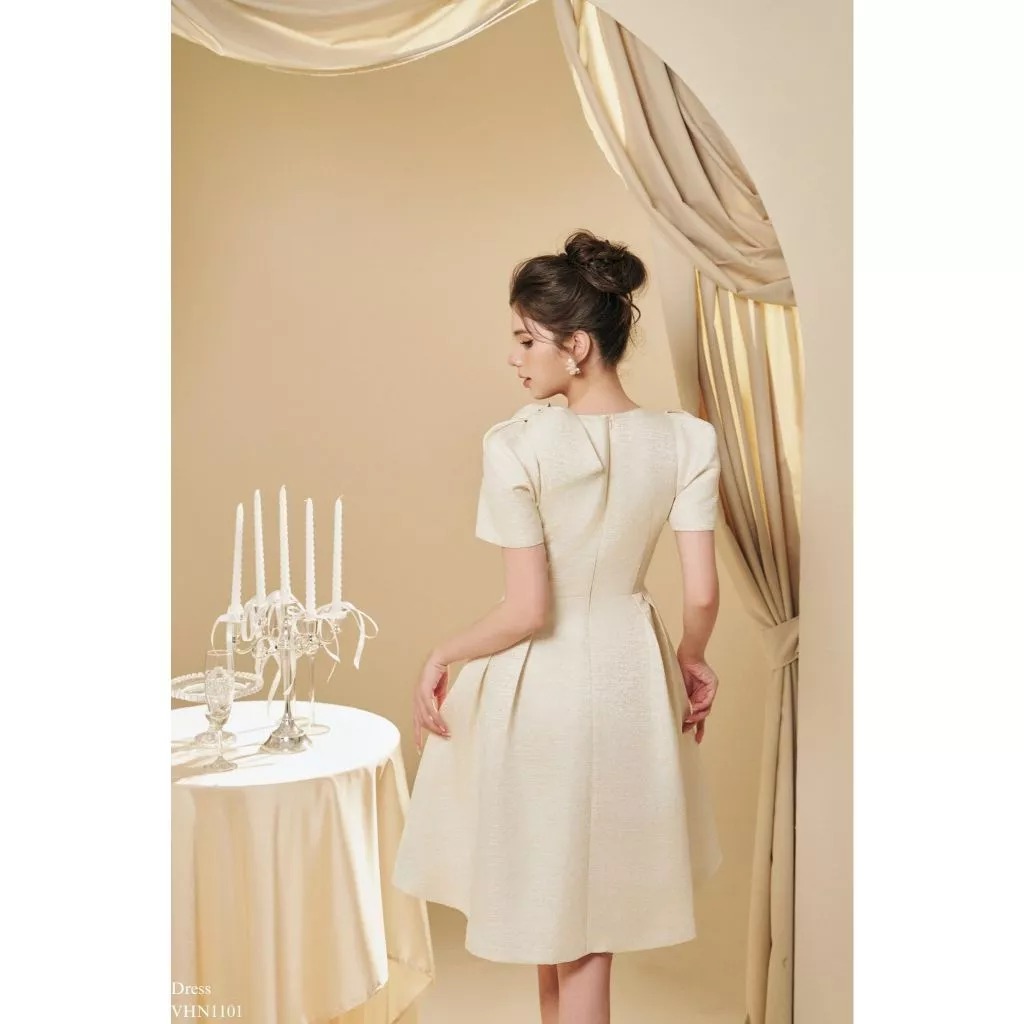 Váy tiệc nữ thiết kế cổ tròn nơ vai chân xếp ly nơ đá nữ tính tiểu thư Tia19 Store